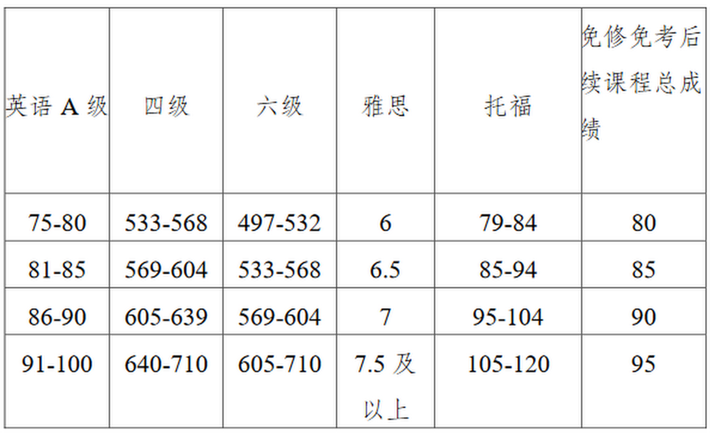 根据《西南大学本科课程成绩评定与管理办法(修订)》(西校〔2019〕608号),全日制本科学生在校期间,参加全国大学英语四、六级考试(简称“四级”、“六级”)、雅思考试、托福考试,或艺体类学生、“双少生”(由学校招生部门认定的少数民族地区的少数民族学生,下同)参加重庆市英语应用能力A级考试(简称“英语A级”),达到相应分数的,可申请一次免修免考公共大学英语后续课程并认定成绩,后续课程的总成绩按下表对应记载,成绩作相应备注,且获准免修免考的公共大学英语课程不能重复申请。