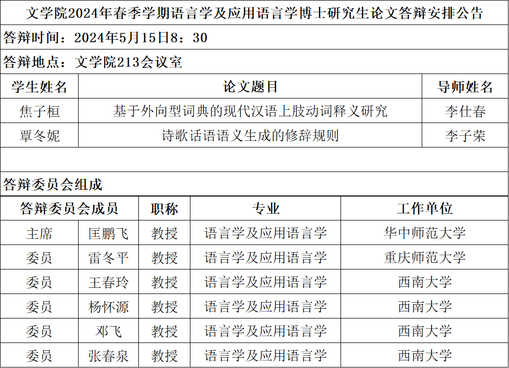 76net必赢官网2024年春季学期语言学及应用语言学专业博士学位论文答辩安排公告