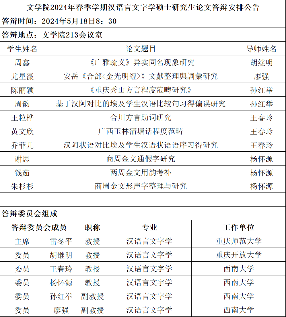 76net必赢官网2024年春季学期汉语言文字学专业硕士学位论文答辩安排公告