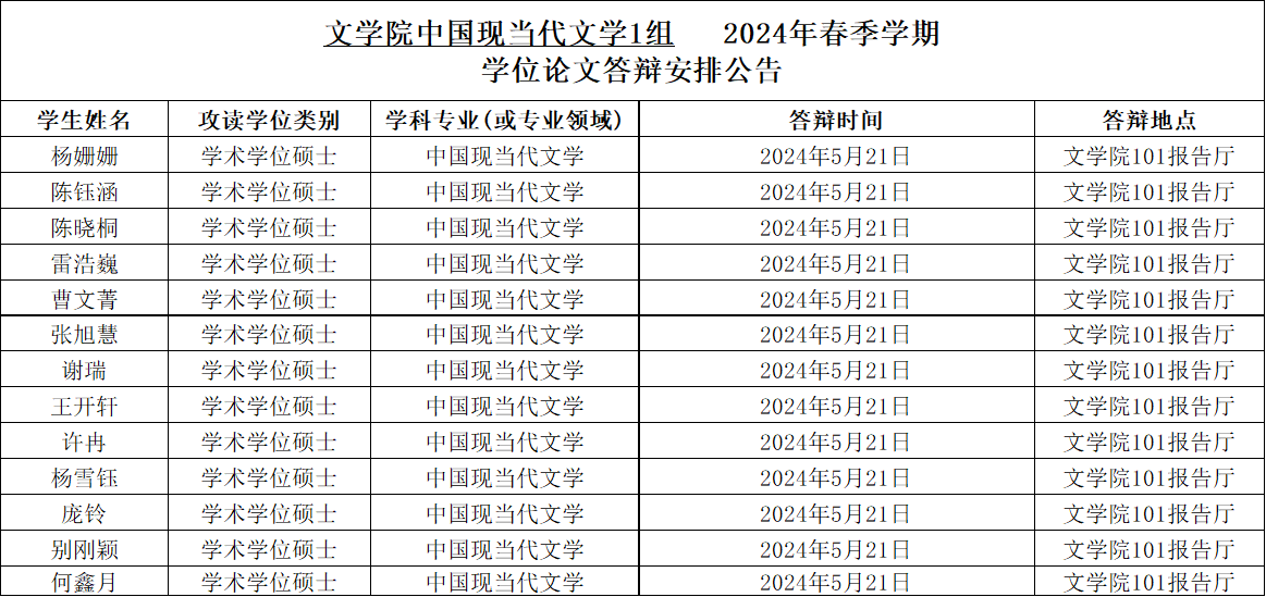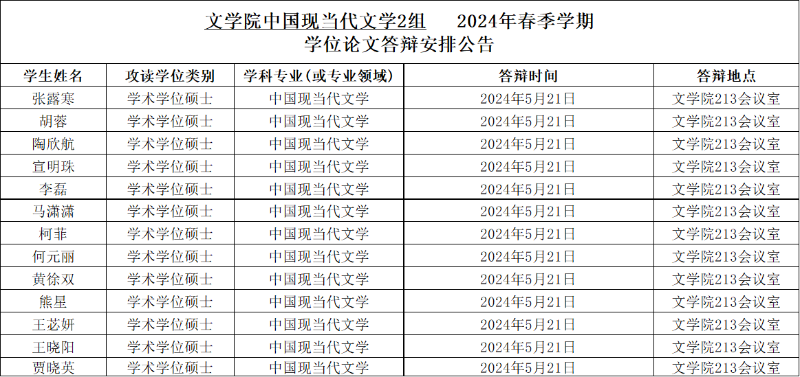 76net必赢官网2024年春季学期中国现当代文学专业硕士学位论文答辩安排公告