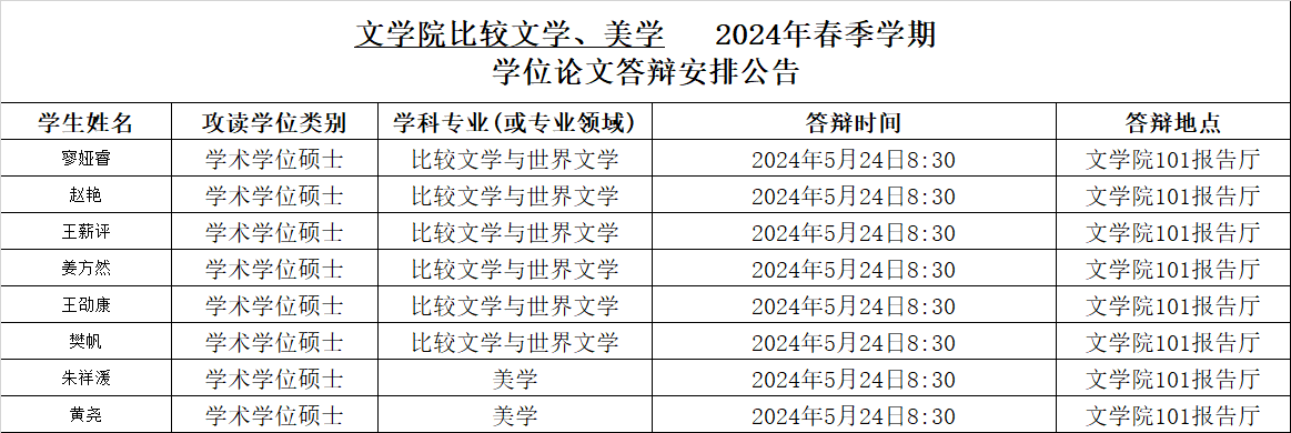 76net必赢官网2024年春季学期比较文学与世界文学、美学专业硕士学位论文答辩安排公告