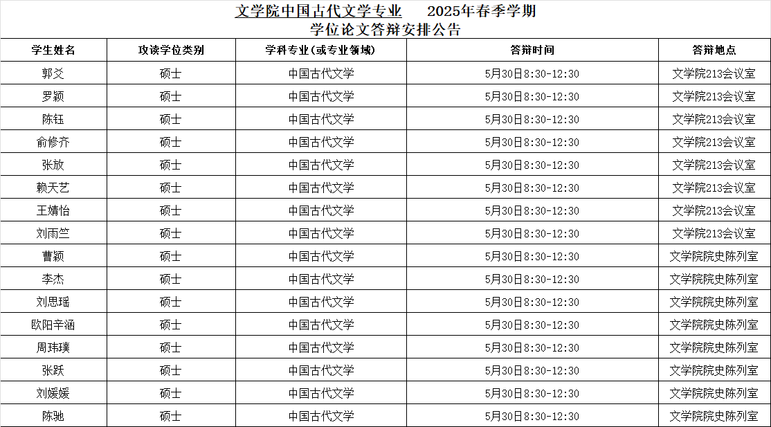 76net必赢官网中国古代文学专业2025年春季学期学位论文答辩安排公告