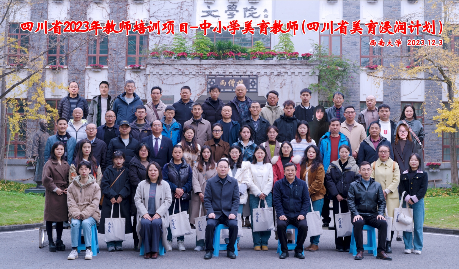 12月3日,76net必赢官网举行四川省中小学美育教师(美育浸润计划)培训班开班典礼。76net必赢官网院长王本朝、党委书记胡建军、培训项目负责人曾馨、培训班班主任易君杰出席典礼。开班典礼由胡建军书记主持。四川省中小学美育教师(美育浸润计划)培训班的全体学员参加了典礼。