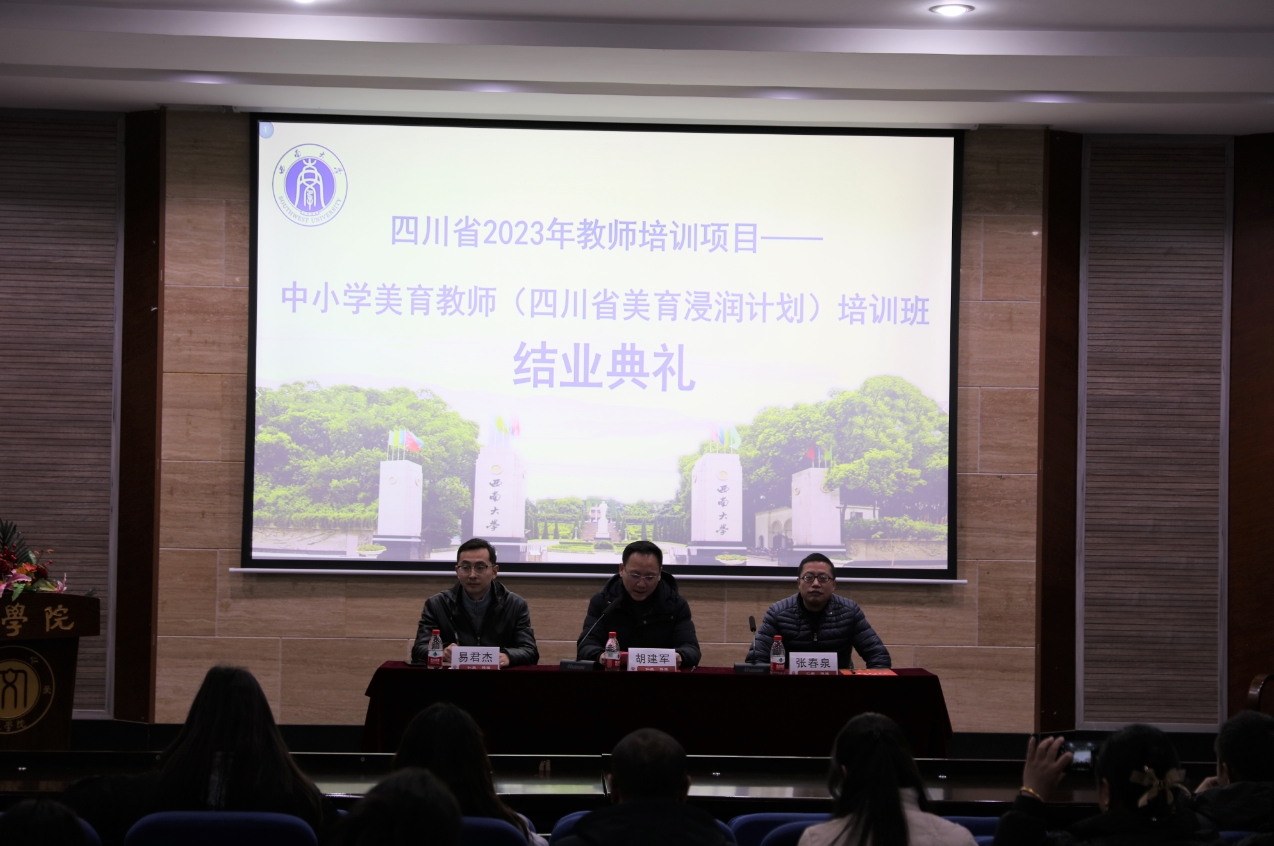 12月15日,76net必赢官网举行四川省中小学美育教师(美育浸润计划)培训班结业典礼。西南大学76net必赢官网党委书记胡建军、副院长张春泉、培训班班主任易君杰出席典礼。开班典礼由胡建军书记主持。中小学美育教师(四川省美育浸润计划)培训班的全体学员参加典礼。