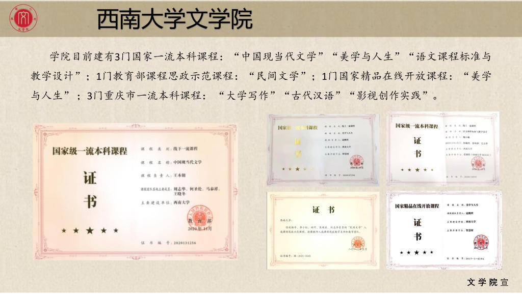 目前学院建有3门国家级一流本科线上线下课程、1门教育部思政示范课程、1门国家精品视频公开课程、1门国家精品在线开放课程、3门重庆市一流本科课程、2门重庆市精品课程、4门校级精品课程、1门校级课程思政课程、10门校级核心课程、10门校级在线开放课程。其中,国家一流线下本科课程:中国现当代文学、语文课程标准与教学设计;国家一流线上本科课程:美学与人生;教育部思政示范课程:民间文学;国家精品视频公开课程:美学与人生;国家精品在线开放课程:美学与人生;重庆市一流本科课程:大学写作、古代汉语、影视创作实践。