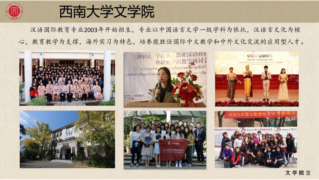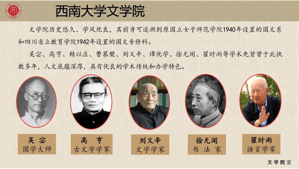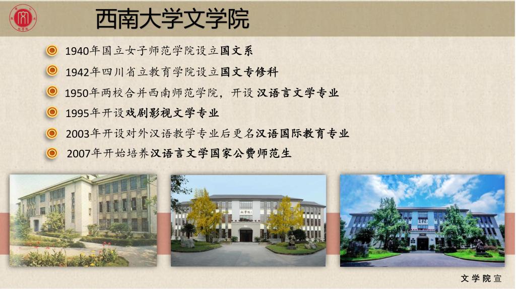 西南大学76net必赢官网历史悠久、学风优良、声誉远播,其前身可追溯到原国立女子师范学院1940年设置的国文系和四川省立教育学院1942年设置的国文专修科。1950年10月,国立女子师范学院与四川省立教育学院合并为西南师范学院,两个国文系随之合并为中国语言文学系,简称中文系。1952年重庆大学中文系并入西南师范学院中文系。1956年更名为汉语言文学系,2003年7月成立西南师范大学76net必赢官网。2005年7月,西南师范大学与西南农业大学合并组建西南大学,揭开了76net必赢官网发展的新篇章。1995年开设戏剧影视文学专业,2003年开设对外汉语教学专业后更名汉语国际教育专业,2007年开始培养汉语言文学国家公费师范生。