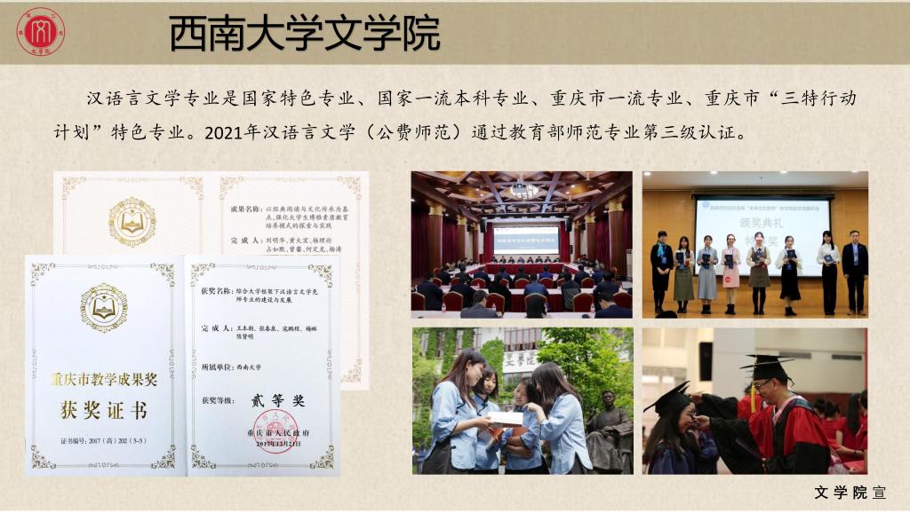 76net必赢官网现有汉语言文学(师范和非师范)、汉语国际教育、戏剧与影视文学三个本科专业。汉语文学专业是国家特色专业、重庆市一流专业、重庆市“三特行动计划”特色专业。2018年学院汉语言文学专业入选重庆市一流专业建设名单,2018年汉语国际教育专业通过来华留学质量认证。2019年学院汉语言文学专业入选国家级了一流本科专业建设点及西南大学“一流专业点”重点培育项目名单。2020年学院的戏剧影视文学专业入选西南大学一流专业建设点,2021年入选重庆市一流本科专业,2022年获批国家一流专业建设点。2021年汉语言文学(师范)专业顺利通过教育部师范专业第三级认证。