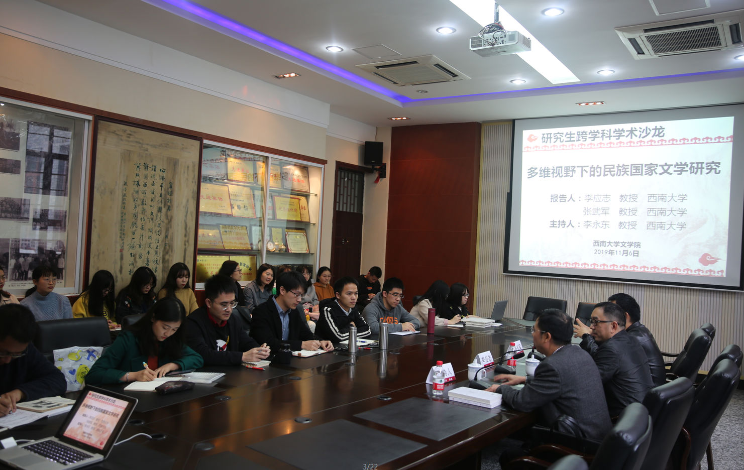 11月6日,“多维视野下的民族国家文学研究”的研究生跨学科学术沙龙成功举办。76net必赢官网李应志教授和张武军教授担任主讲嘉宾,2019级中国现当代文学专业博士研究生卢阿涛同学、邹佳良同学、廖志翔同学、李燕君同学担任评议人。活动由76net必赢官网李永东教授主持,76net必赢官网40余位研究生参加了此次活动。