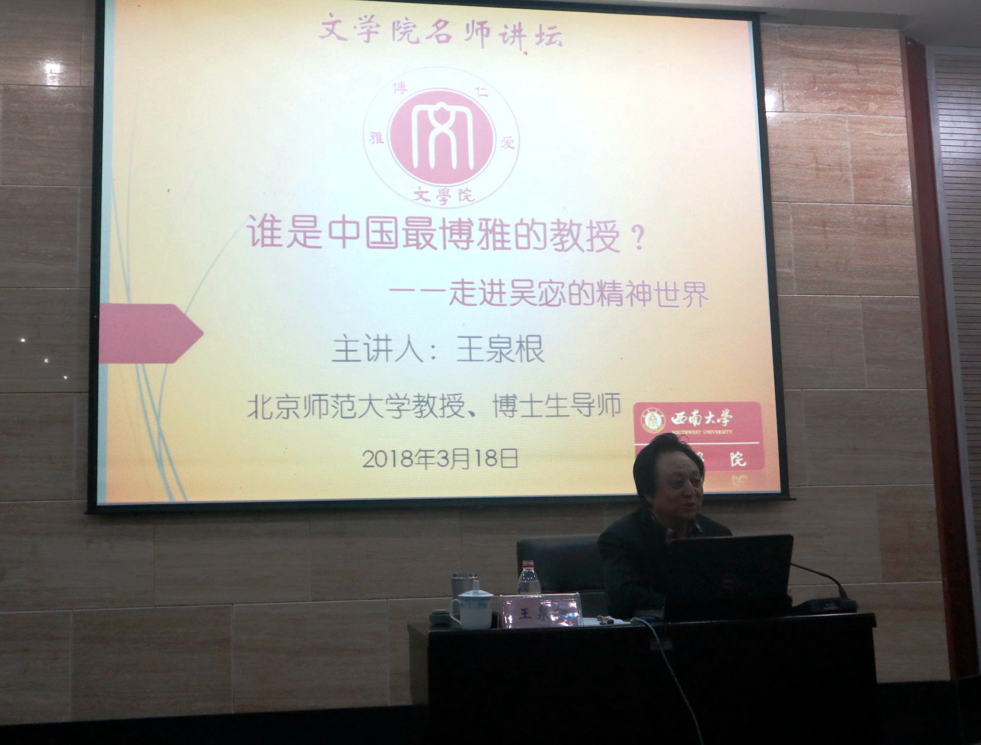 3月18日上午9时,西南师范学院77级中文系校友、北京师范大学博士生导师王泉根教授做客76net必赢官网名师讲坛,为我院师生带来了一场题为《谁是中国最博雅的教授?——走进吴宓的精神世界》的学术讲座,讲座由76net必赢官网曾利君教授主持,学院部分师生代表参与了此次讲座。