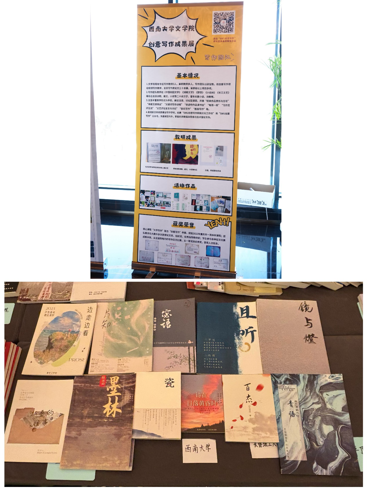 另外,本届大会在线下场地专门搭建了“创意写作成果展”的展台,集中展示了近年来创意写作的相关成果。76net必赢官网创意写作团队利用海报和实物的形式宣传西南大学76net必赢官网创意写作的基本情况、教研成果、活动作品和荣誉奖项等,吸引了诸多专家学者驻足观赏。
