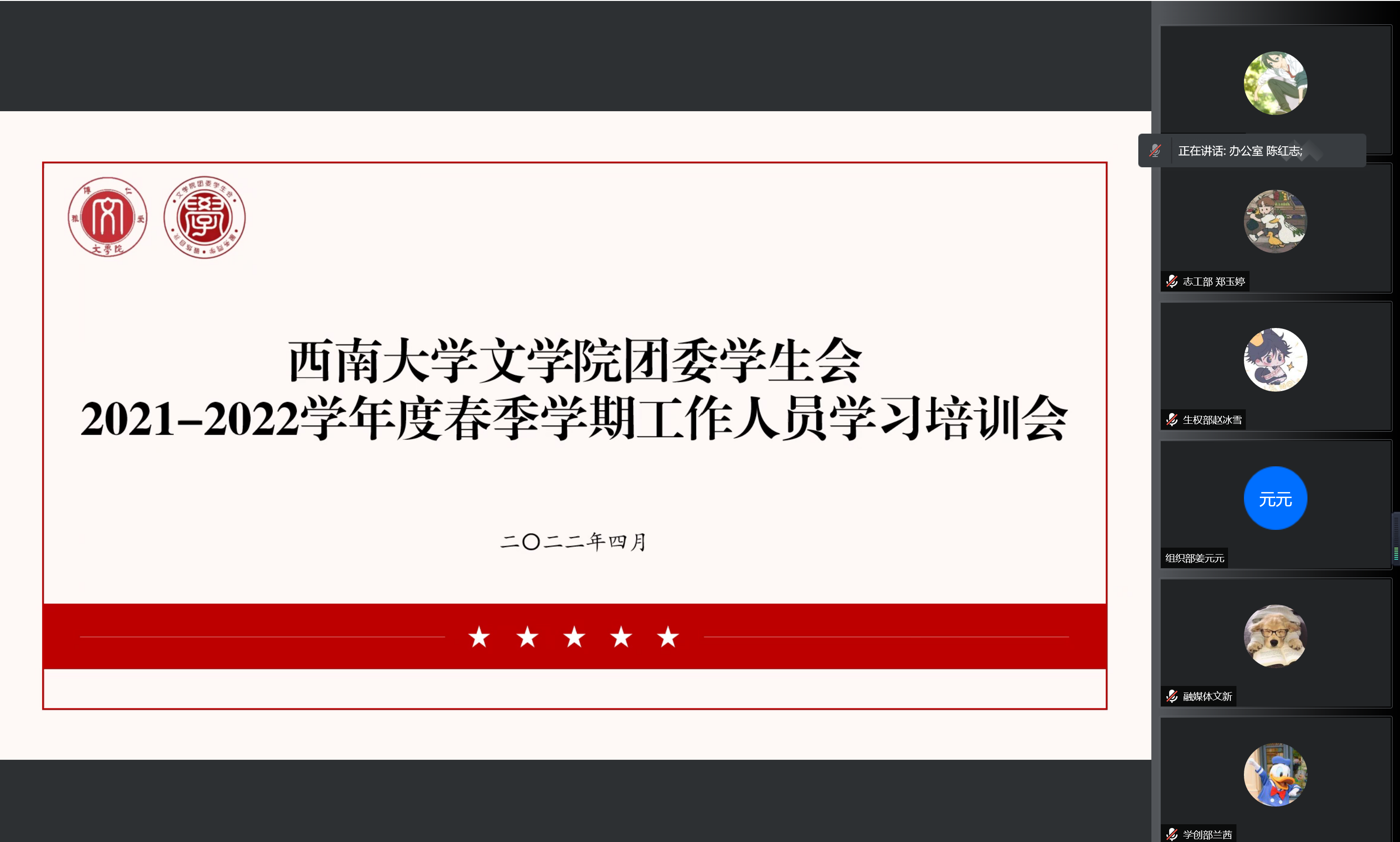 4月1日下午,西南大学76net必赢官网团委学生会线上举行2021-2022学年度春季学期工作人员学习培训会。会议由76net必赢官网团委学生会艺术团陈红志同学主持,各部门工作人员参会。