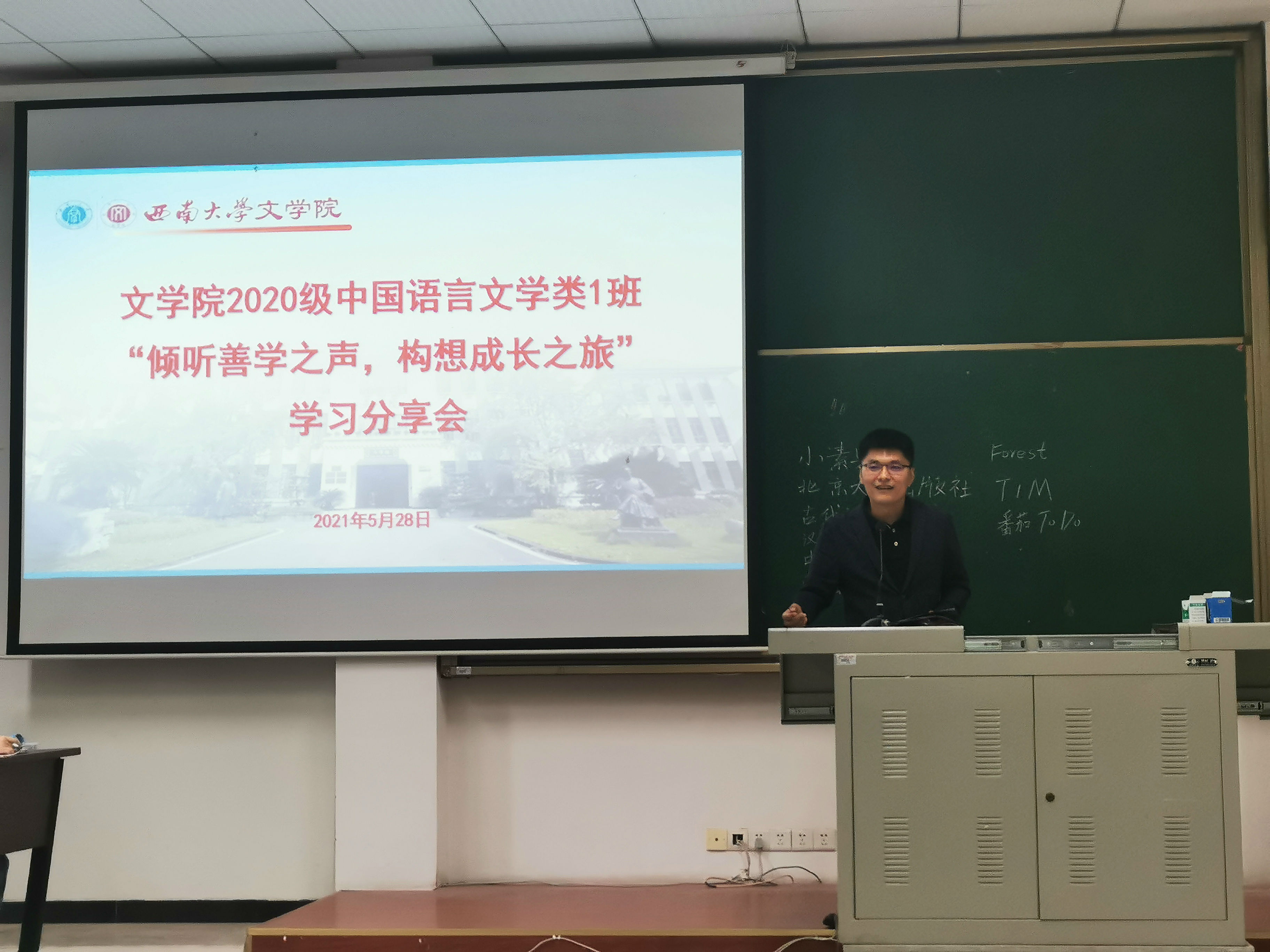 熊婧、余静雯、郭泽琛、邓宇婷4位同学主动从专业学习、时间管理等方面分享了自己的经验方法。保研至四川大学中国现当代文学专业的2017级学生孙旭江介绍了自己的学习科研、学生工作等方面的经历,希望学弟学妹能认真走好大学每一步。2018级本科生辅导员唐利平将长远目标与当下需求相结合,强调学生要增强生涯规划意,提高自身竞争力。