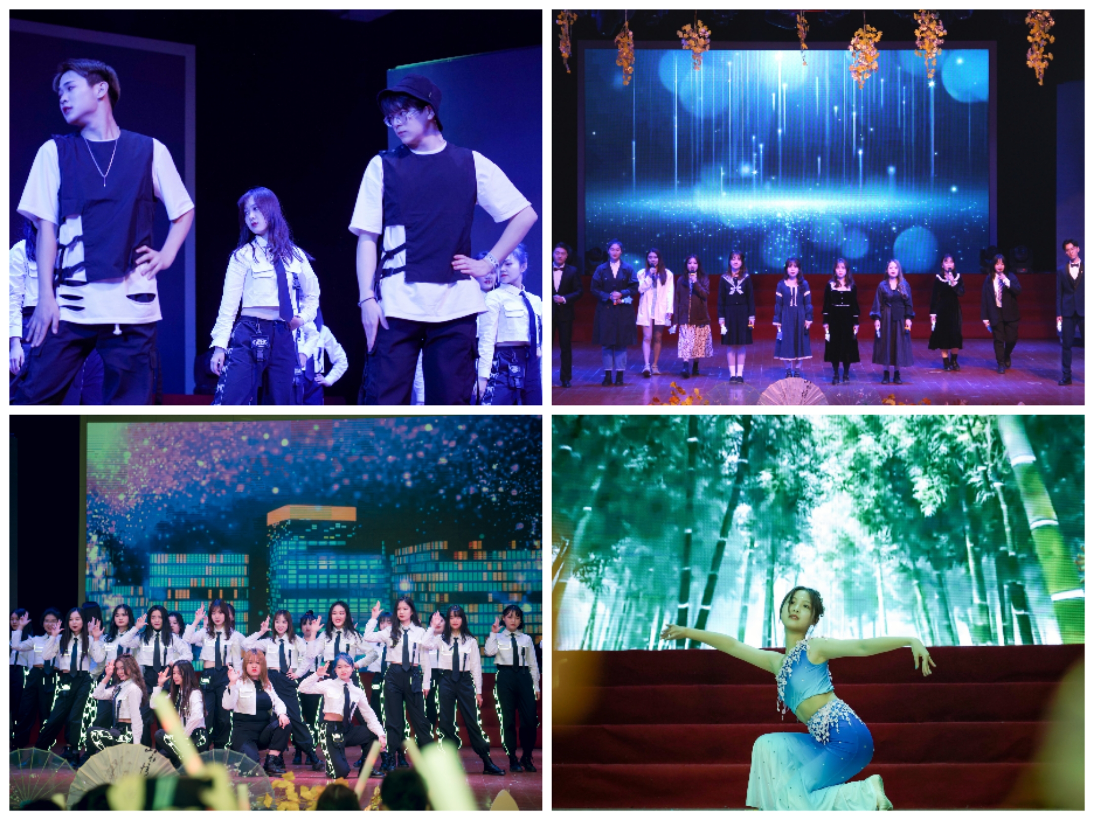 小品展示欢乐多多,《文院新闻联播》以幽默诙谐的话语、搞笑热点的图片、应景到位的音乐讲述校园热点事件,拉近与观众的距离。《疯狂的红包》以时事现象分析演绎为切入点感谢医务工作者无私付出,触发观众深思。走秀《百年惊梦》展示时代印记,彰显独特风采,引起现场掌声阵阵。英文歌曲《For forever》、主席团歌曲《星辰大海》配合默契,延伸未来遐想。歌舞乐《我的祖国》气势磅礴,用真切话语礼赞祖国。朗诵《逆行之人,腾飞之国》致敬抗击病毒、拥有“逆光翅膀”的各界人士。