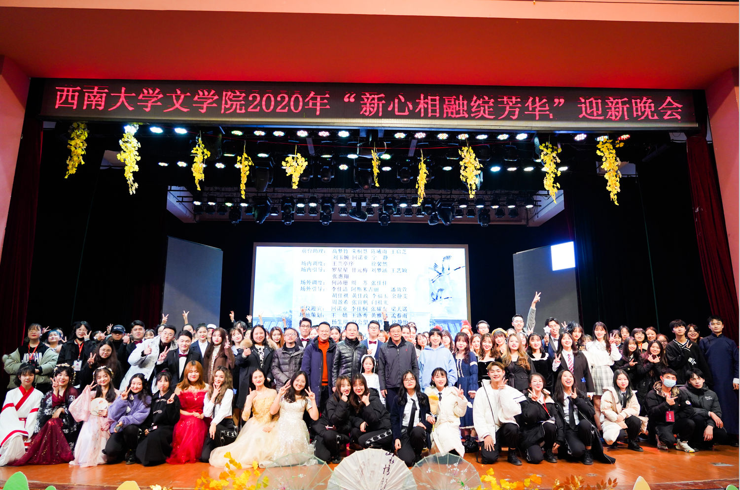 2020年12月23日,76net必赢官网在光大礼堂成功举办2020“新心相融绽芳华”迎新晚会。76net必赢官网院长王本朝、党委书记胡建军、党委副书记纪委书记邓洪波、党委副书记陈玥、副院长张春泉出席及学院部分教师出席晚会。