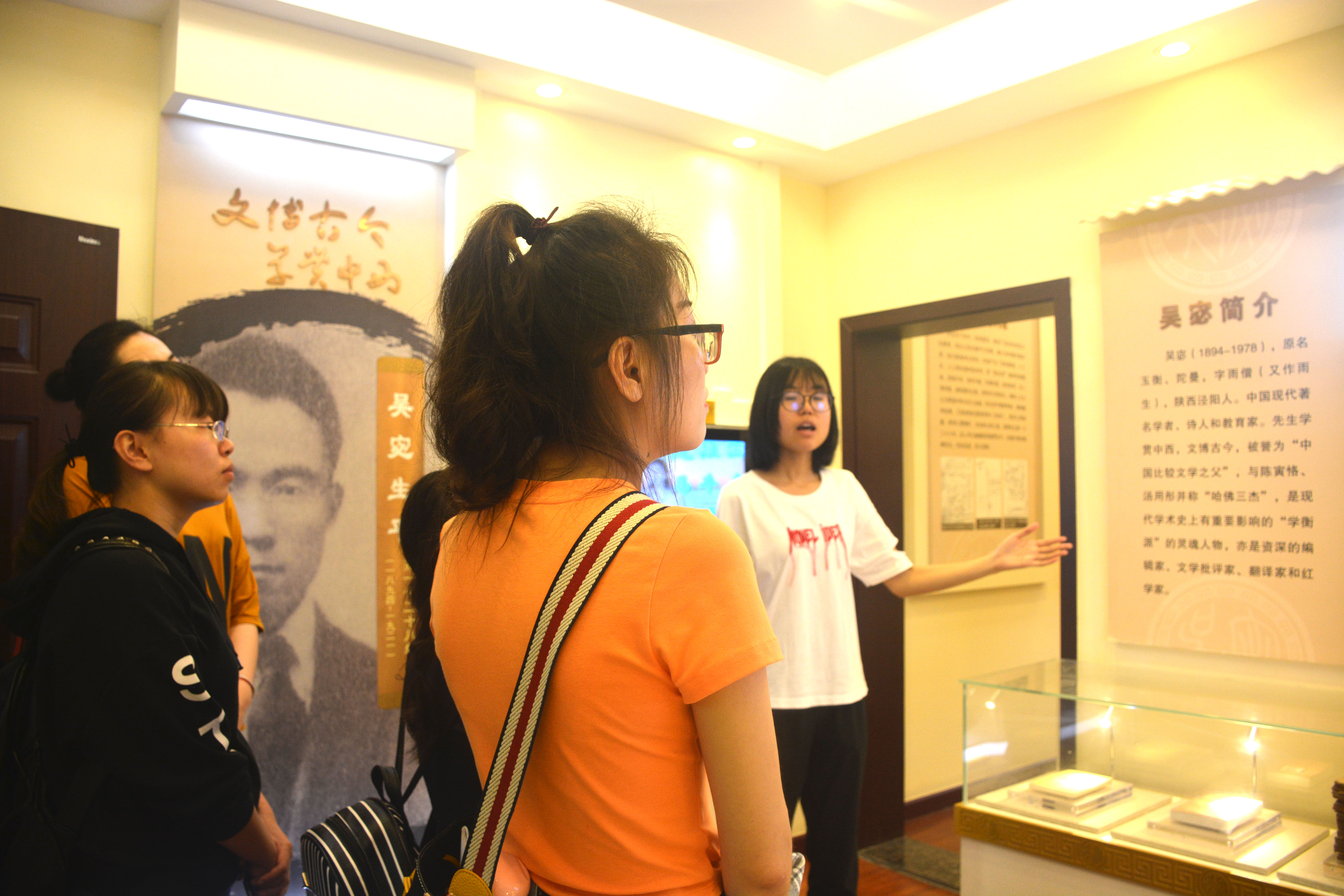 随后,活动地点转向位于博雅广场一侧的吴宓旧居陈列室。陈列室内包括吴宓研究中心、学术交流中心、吴宓生平陈列展等,展品涵盖吴宓的译作、红学著作、部分书信、手稿等,完整地再现了这位国学大师的一生。在76net必赢官网讲解员的带领下,同学们对吴宓先生的求学经历、教育思想和学术成就等有了全面而系统的了解,更加深刻地感受到吴宓先生人文精神和教育思想的可贵、可敬。