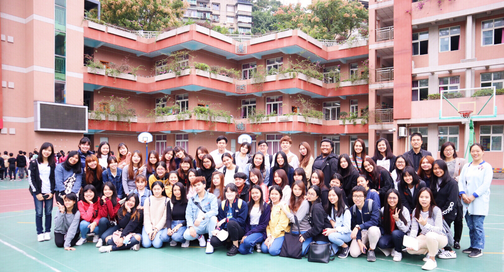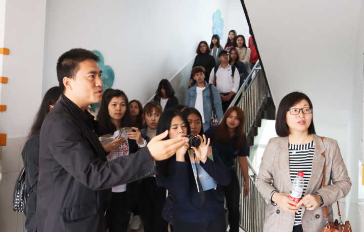 语文课观摩结束后,附小教务处主任潘德来老师带领全体泰国留学生对学校进行了参观。潘老师介绍到,屋顶改建为学生可以活动的操场是附小的一大特色。不同年级所在教室外的廊道文化有其对应年级的特色。同时还补充到,附小非常重视国学教育。随后同学们还参观了逸夫楼的音乐、美术等艺术课堂,更全面地了解了西大学附属小学。十一点左右,本次泰国留学生参观西南大学附属小学的活动在全体师生的合影中顺利结束。
