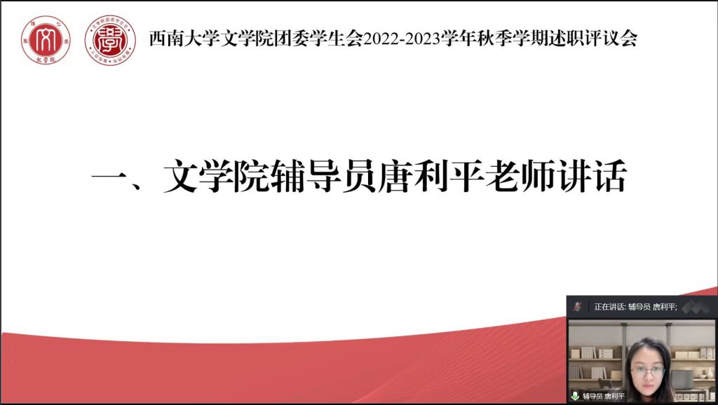 12月30日,76net必赢官网团委学生会2022-2023学年秋季学期述职评议会在线上召开。76net必赢官网2022级本科生辅导员唐利平出席会议,76net必赢官网团委学生会主要学生干部、各部门负责人及76net必赢官网学生代表参会。