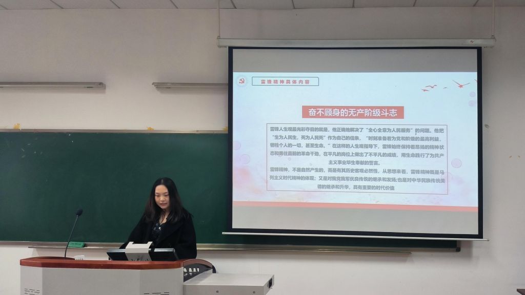 杨倩介绍了雷锋的生平事迹,与会成员们在雷锋短暂而充实的生命历程中,感受到了雷锋一生中这一桩桩平凡小事汇聚为河流的感人力量。杨倩对雷锋精神的具体内涵进行了分析讲解。雷锋精神的伟大和高尚来源于一次次具体而细小行为的积累:参军入伍、积极工作、助人为乐等。雷锋始终坚定信仰,忠于党组织,爱岗敬业,甘于奉献。雷锋的宝贵精神品质不仅在当时受到广泛赞扬,对今天而言,仍然具有重要的时代价值,是实现民族复兴的强大精神支撑。生活在当下的莘莘学子应当同雷锋一样严格要求自己,在生活、学习中提升自我,争做有理想、敢担当、能吃苦、肯奋斗的新时代好青年,用实际行动书写新时代的雷锋故事。