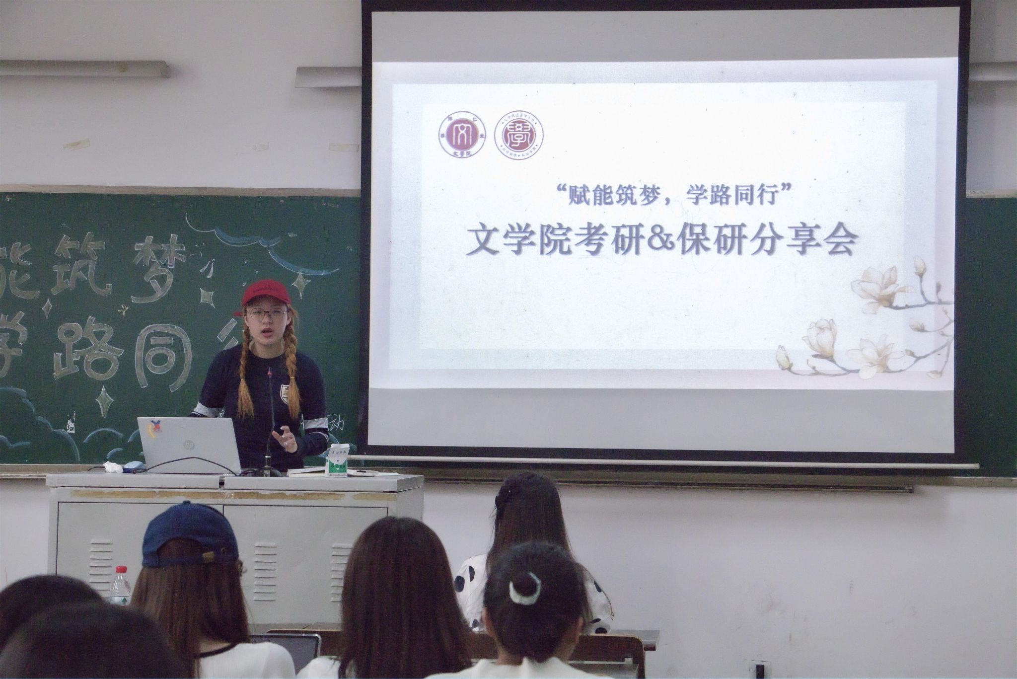 罗莉围绕自身考研经验与同学们进行分享。她首先向同学们介绍了考研科目、考研分数线等情况。随后,她从困难和选择两个角度出发,鼓励同学们勇敢追梦。接着,罗莉向同学们强调学习方法的第一性,并围绕读书、看书、做笔记与到场同学分享经验。