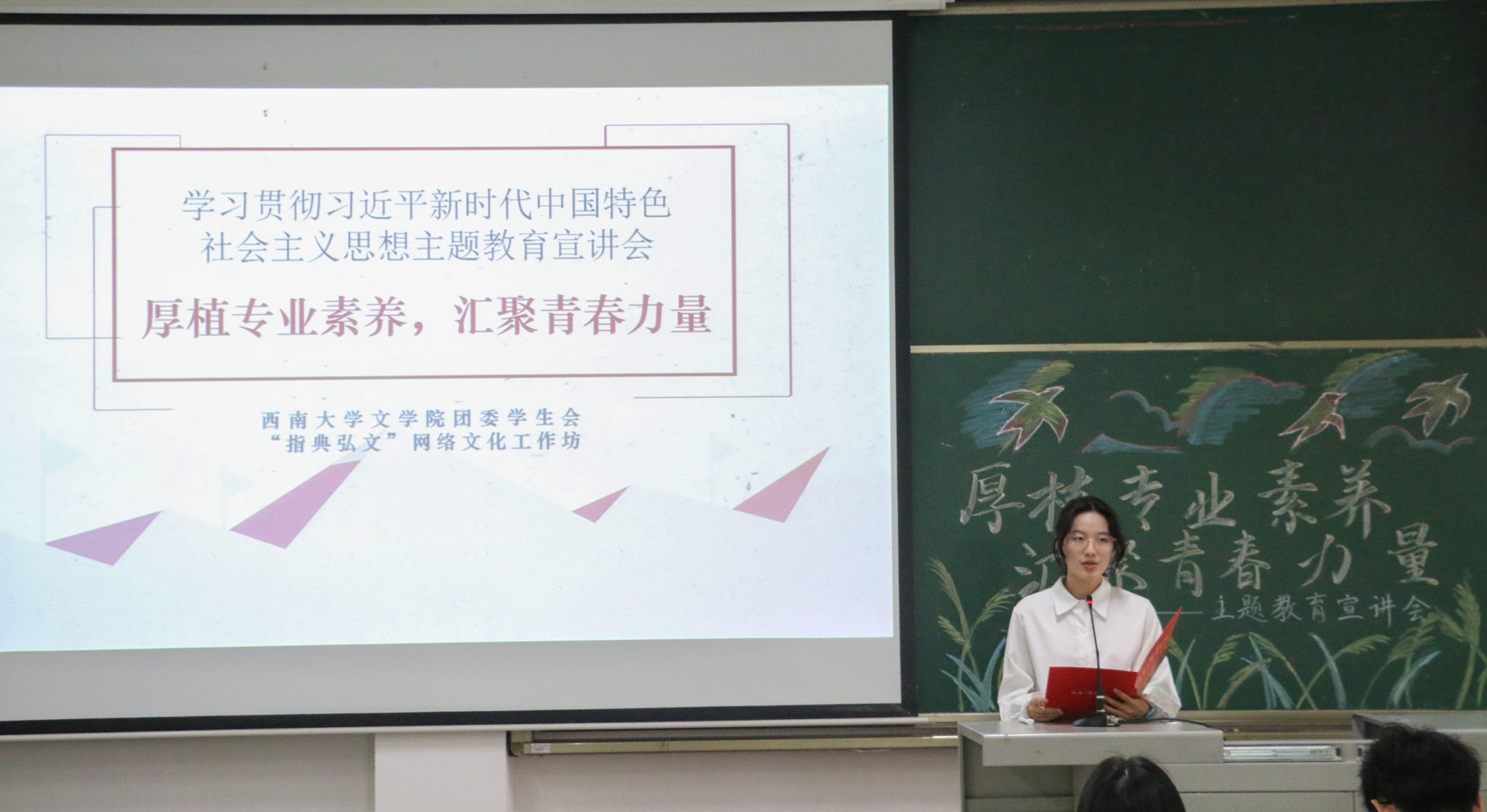 为推动习近平新时代中国特色社会主义思想和党的二十大精神入脑入心,充分发挥青年朋辈示范引领作用,6月6日,76net必赢官网举办“厚植专业素养,汇聚青春力量”主题宣讲会。2019级公费师范专业马宁同学、2020级汉语言文学专业博雅班曾梓莘同学就如何全方位提升专业素养,服务人才强国战略进行主题分享,76net必赢官网党员骨干和团员骨干参加宣讲会。