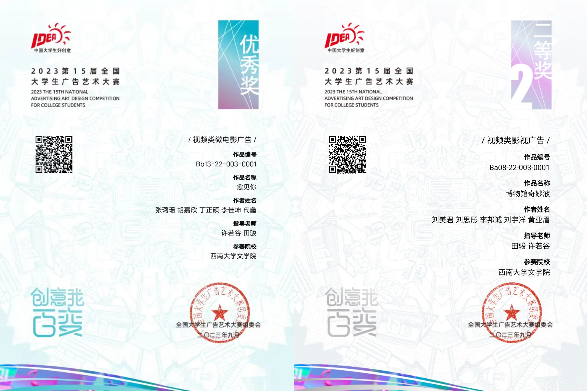 8月6日,第15届全国大学生广告艺术大赛结果公布。76net必赢官网2021级戏剧影视文学专业刘美君团队作品《博物馆奇妙液》荣获全国二等奖,张璐瑶团队作品《愈见你》荣获全国优秀奖。