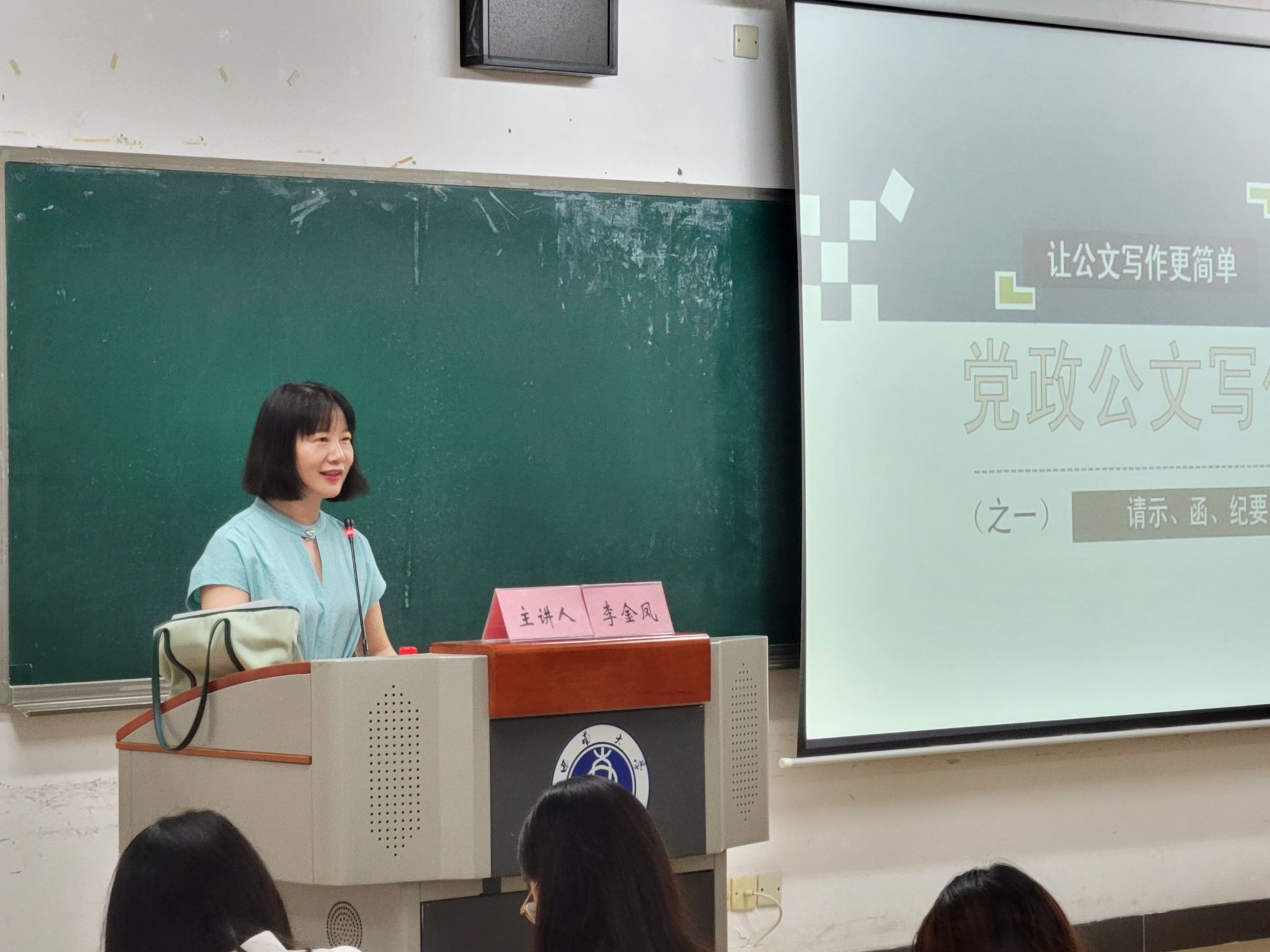 开营仪式后,李金凤副教授讲授了“党政机关公文写作(一)——报请类、商洽类、纪要类等公文”课程。她详细介绍了“请示”“函”以及“纪要”三种公文的含义、特点、写法以及注意事项。除此之外,她还介绍了学习公文写作的方法及相关学习资料的查阅方式。第一讲课程节奏快但“干货满满”,李老师将知识点与实际案例和真题相结合,在循循善诱中指导各位学员掌握了如换位思考、突出重点、表述客观具体等相关知识点,并手把手带着同学们进行公文写作的实战演练。学员们也积极参与问答,整堂课堂气氛轻松融洽。