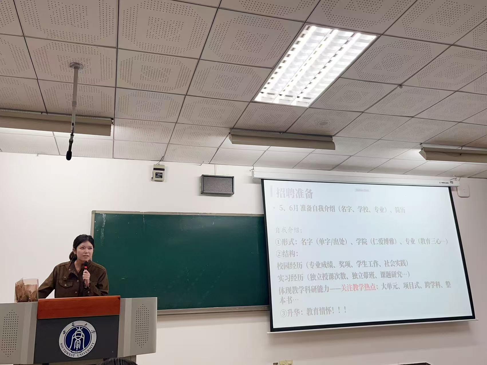 活动中,陈钰同学着眼师范生基本功,分享求职经验。张珂睿同学结合自身经历,分析应聘要点。赵秉珠同学利用思维导图说明实习与未来工作的关系。