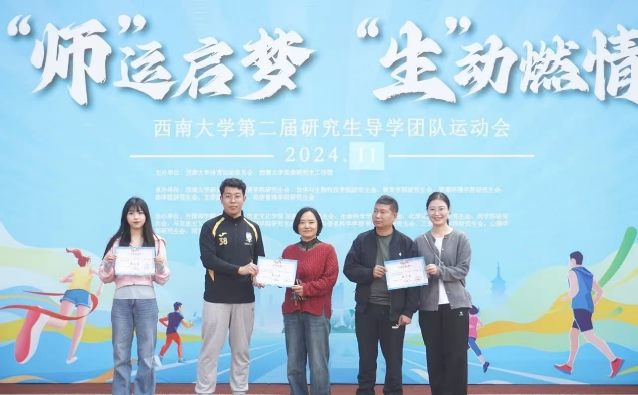 2024年10月14日至11月10日,76net必赢官网张武军、李应志、刘宇清、董宪臣、李君威五位老师与76net必赢官网33位研究生组成亲“宓”无间队参加了西南大学第二届“‘师’运启梦,‘生’动燃情”研究生导学团队运动会。
