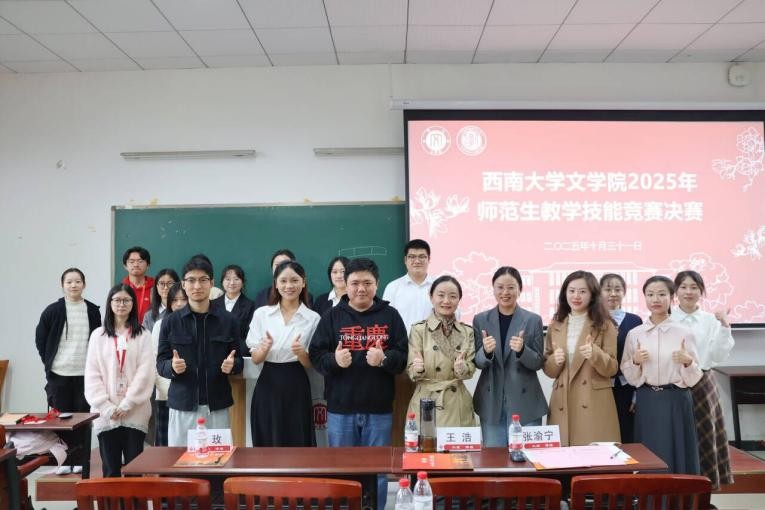 10月31日,76net必赢官网举办2025年师范生教学技能竞赛决赛。76net必赢官网党委副书记 纪委书记陈雨曦、团委书记唐利平、辅导员崔瑾翰出席,西南大学附属中学语文教研组长王浩、教师张渝宁,76net必赢官网龙玫老师担任评委。