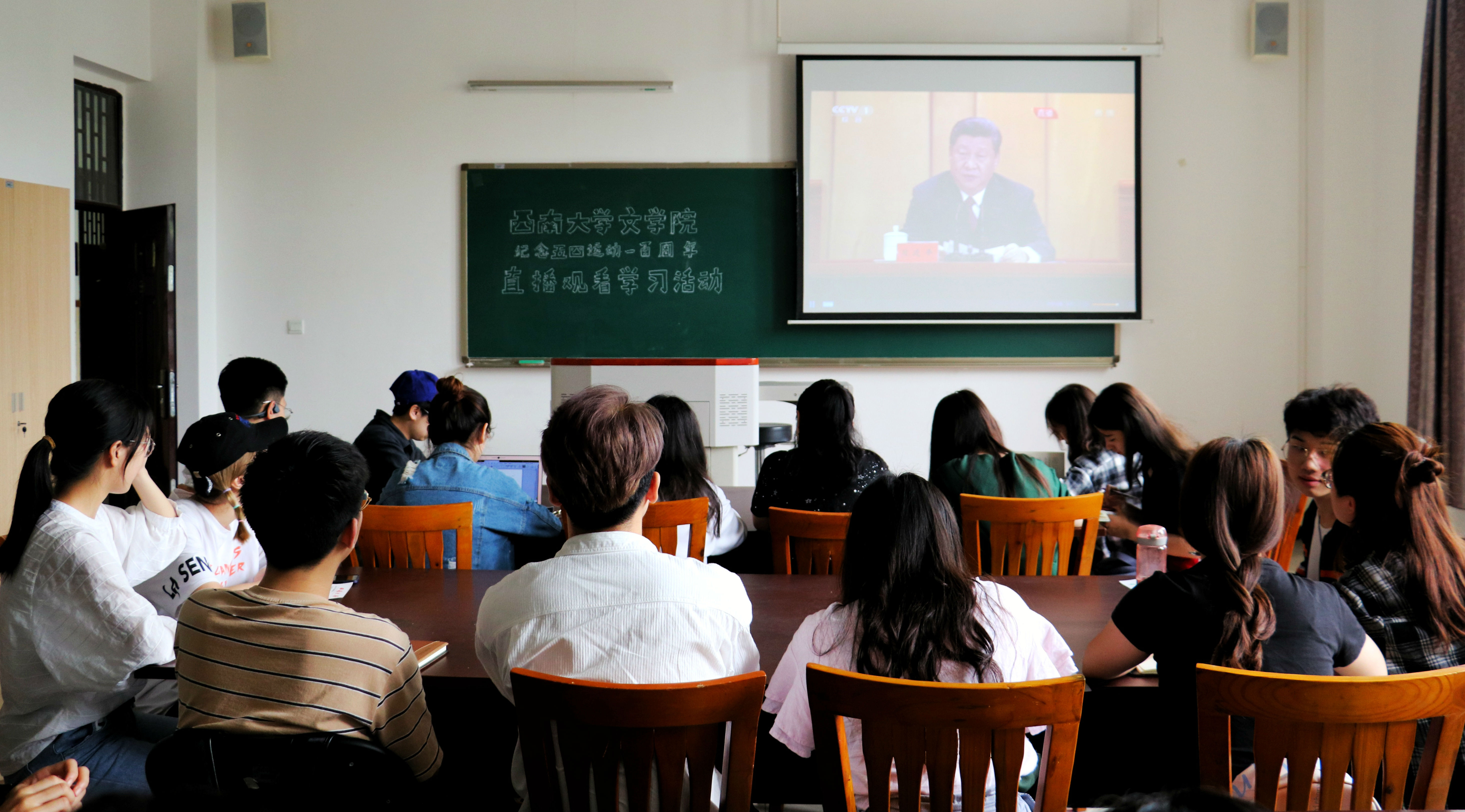 4月30日上午10时30分,纪念五四运动一百周年大会在人民大会堂举行。中共中央总书记、国家主席、中央军委主席习近平出席大会并发表了重要讲话。西南大学76net必赢官网304教室举行了观看直播学习活动,76net必赢官网团委学生会部分成员到场观看。