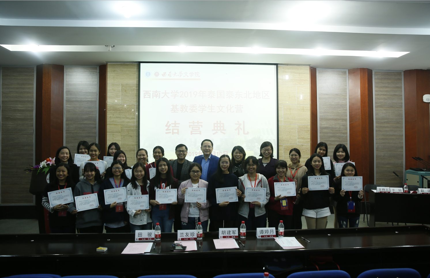 最后,胡建军书记为全体营员颁发结业证书。至此,西南大学2019年泰国泰东北地区基教委学生文化营结营典礼圆满结束。