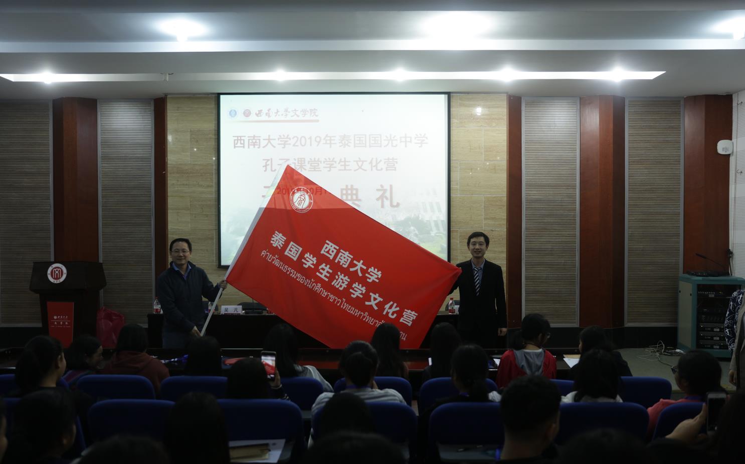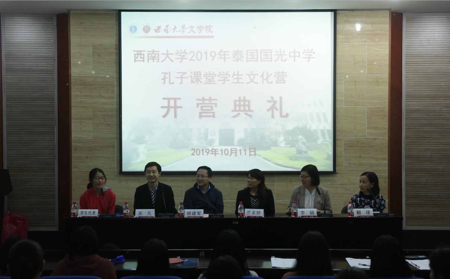 10月11日,西南大学 2019年泰国国光中学孔子课堂文化营在我院开营典礼。泰国国光中学孔子课堂文化营领队吴凡老师,76net必赢官网党委胡建军书记、网络与继续教育办公室兰友珍主任、汉语国际教育系李娟老师出席本次活动,文化营全体30名营员参加了活动。开营典礼由李娟老师主持,泰国留学生刘璐同学担任翻译。