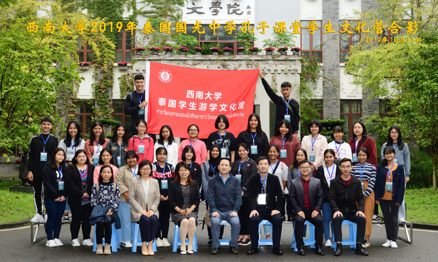最后,与会领导和全体营员在雨僧楼前合影留念。至此,西南大学 2019年泰国国光中学孔子课堂文化营开营典礼圆满结束。