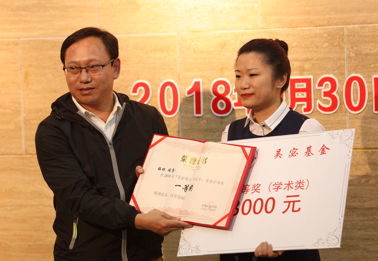 西南大学副校长丁忠民为捐赠人颁发捐赠证书,76net必赢官网院长王本朝宣布2018年“吴密基金”获奖名单,捐赠方代表和与会领导为首届“吴密基金”获奖学生颁发获奖证书。