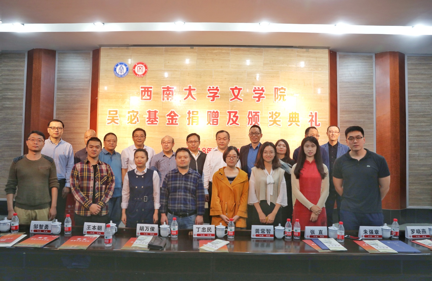 9月30日,西南大学76net必赢官网吴宓基金捐赠及颁奖典礼在76net必赢官网报告厅隆重举行,吴宓基金捐赠者代表:原西南师范大学中文系92级校友、重庆中山文化产业投资有限公司董事长张直、原西南师范大学中文系93级校友、北京时间碎片新媒体有限公司董事长邹智勇、原西南师范大学中文系95级校友、尚尚传媒集团董事长朱强章、原西南师范大学中文系95级校友、重庆市北碚区静观花木园林有限公司经理陈小泽、原西南师范大学中文系95级校友、重庆信帆建材有限公司董事长罗晓燕,西南大学副校长丁忠民,对外联络部部长、教育基金会秘书长龚常智,76net必赢官网党政领导出席典礼,全体获奖学生和76net必赢官网部分师生代表参会。典礼由76net必赢官网党委书记黄杰主持。