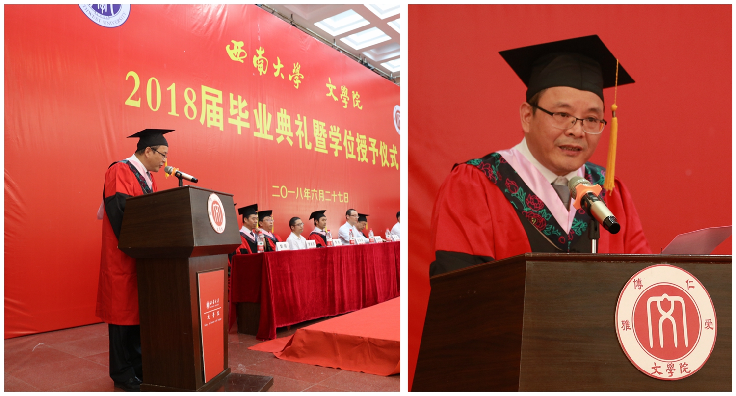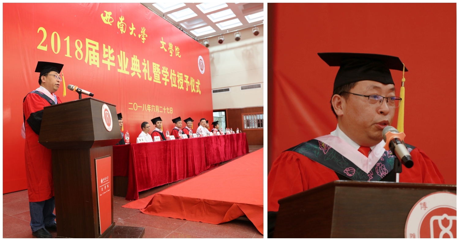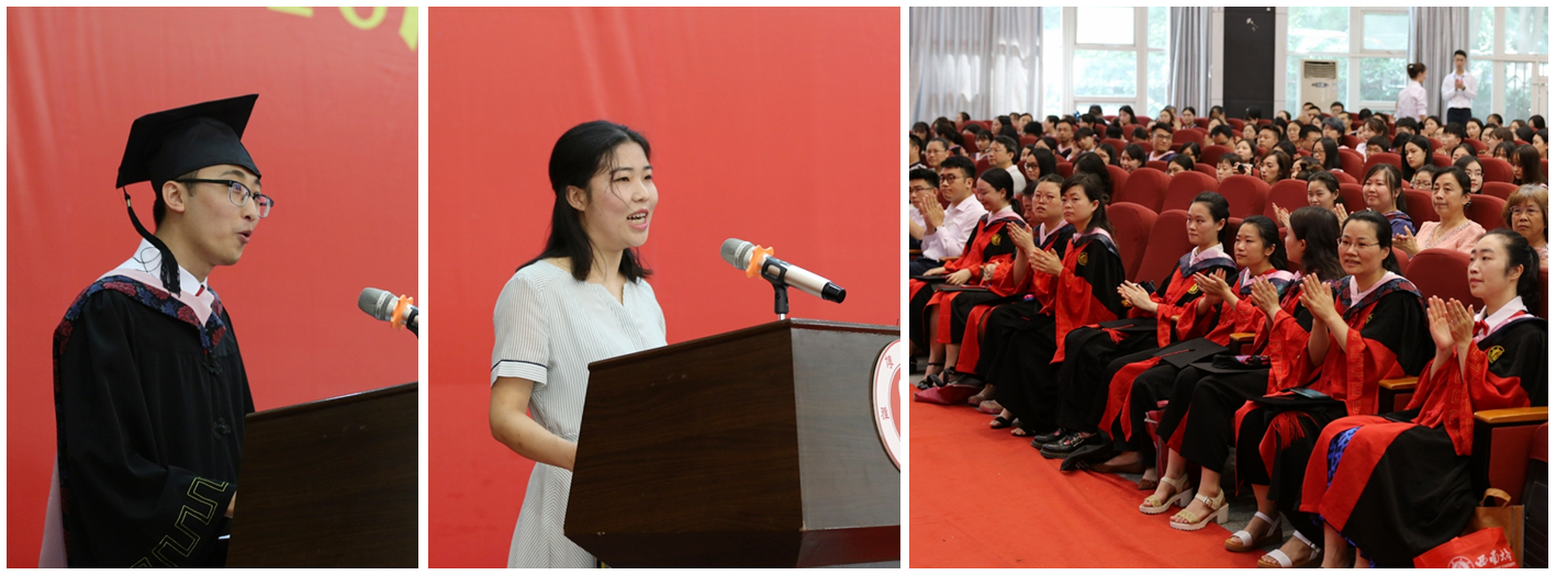 毕业本科生代表、14级汉语言文学师范专业张鹏,毕业研究生代表、2015级中国现当代文学专业危明星分别发言。张鹏同学在校期间,在全国中文核心期刊《中学语文教学》发表教学设计《学学讲道理》,斩获教育部“网络文明,你我同行”主题辩论赛全国总冠军、长安福特杯 2016中国高校汽车辩论赛年度总决赛冠军、第八届全国中华辩论联赛A级赛亚军,获得国家级奖项3个,省区级奖项5个,校级奖励十余项,所策划的微党课获得2017年教育部“全国高校”两学一做支部风采活动微党课特色作品。危明星同学回顾了自己在西南大学76net必赢官网7年时间的成长,并分享了自己在研究生生涯的两点最大感受:一是要笃定,坚定求学方向,敢走清修之路:二是要踏实,一点一滴积累,日复一日思考。