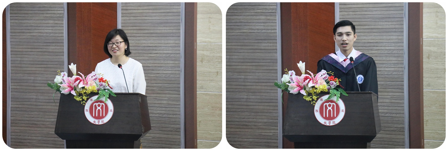 最后,荣获2017年度中国政府优秀来华留学生奖学金的泰国留学生艾丹龙代表全体学生发言。艾丹龙同学以一口流利的汉语饱蘸情感诉出衷肠,他代表全体留学生对辛勤培育他们的老师表达诚挚的感谢,对支持自己完成学业的父母敬以深深的感激,对同窗共读的同学表达依依别情。