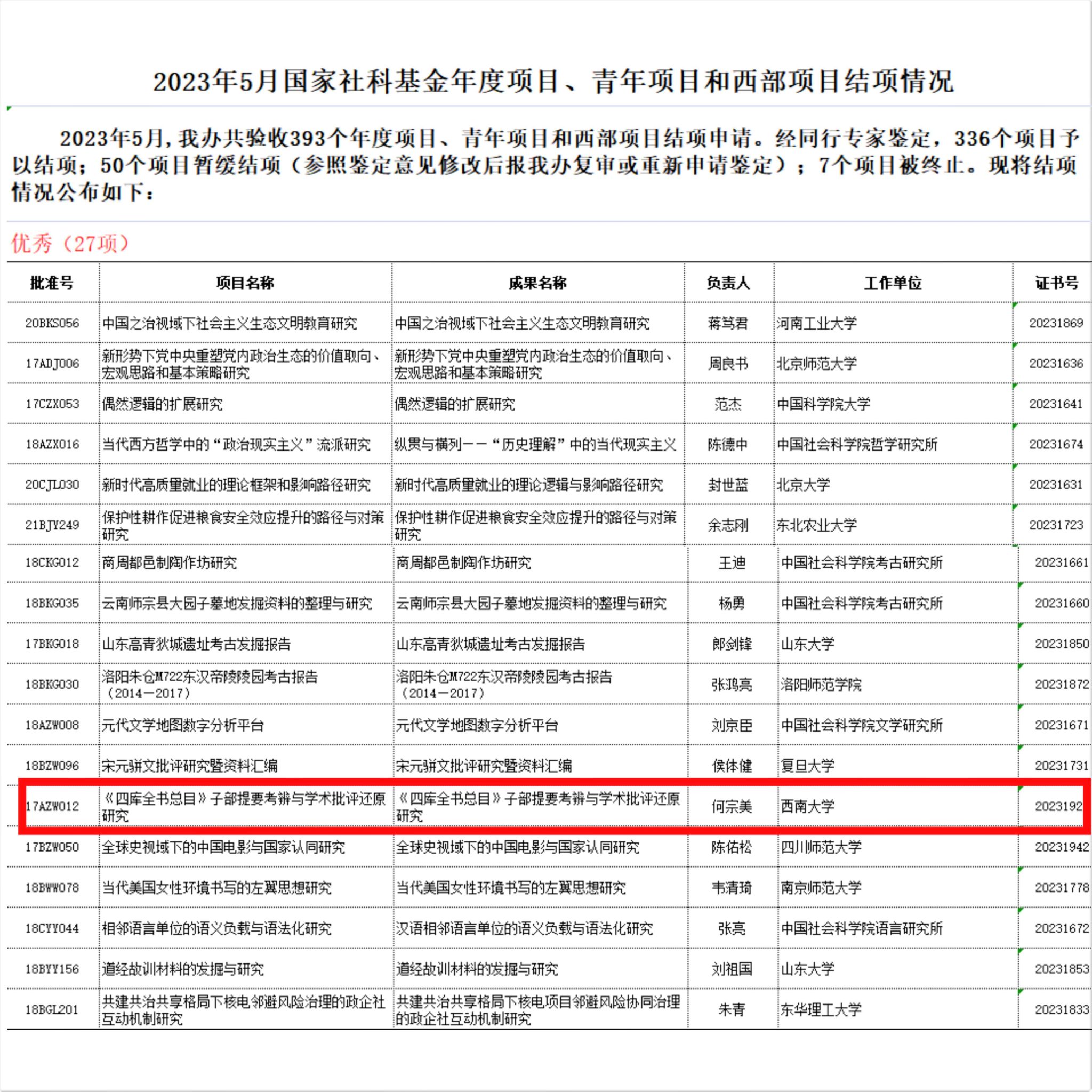 据全国哲学社会科学工作办公室2023年5月30日公布的《2023年5月国家社科基金年度项目、青年项目和西部项目结项情况》,76net必赢官网何宗美教授的国家社科基金重点项目成果《〈四库全书总目〉子部提要考辨与学术批评还原研究》通过鉴定,并荣获“优秀”,为此次全国336项成果中获“优秀”等级的27项成果之一。何宗美教授所主持的国家社科基金项目成果已连续三次获得结项优秀,此前有重点项目和一般项目各一项获此佳绩,并分别入选2010年度首批《国家哲学社会科学成果文库》和2016年度《国家哲学社会科学成果文库》。