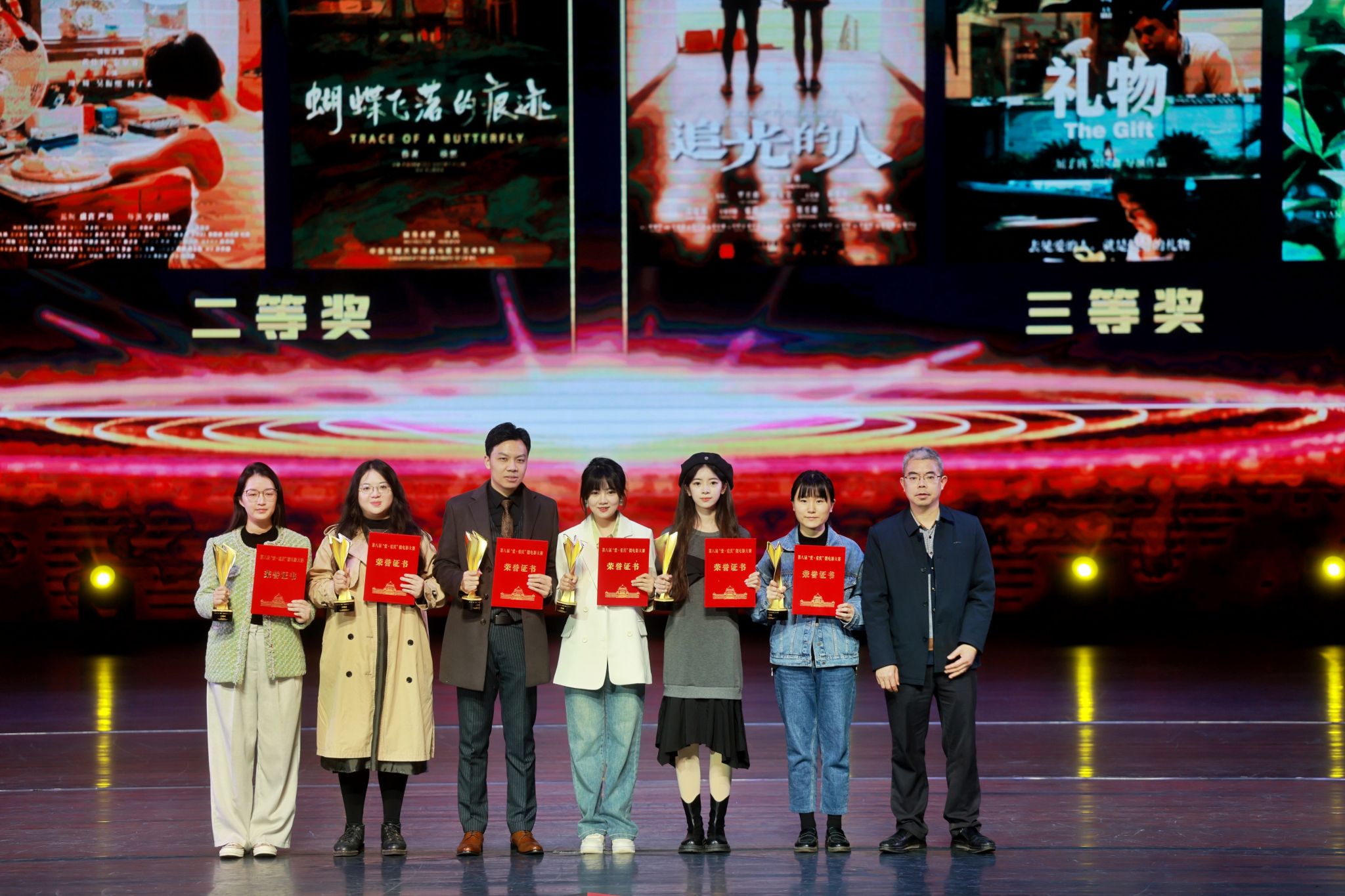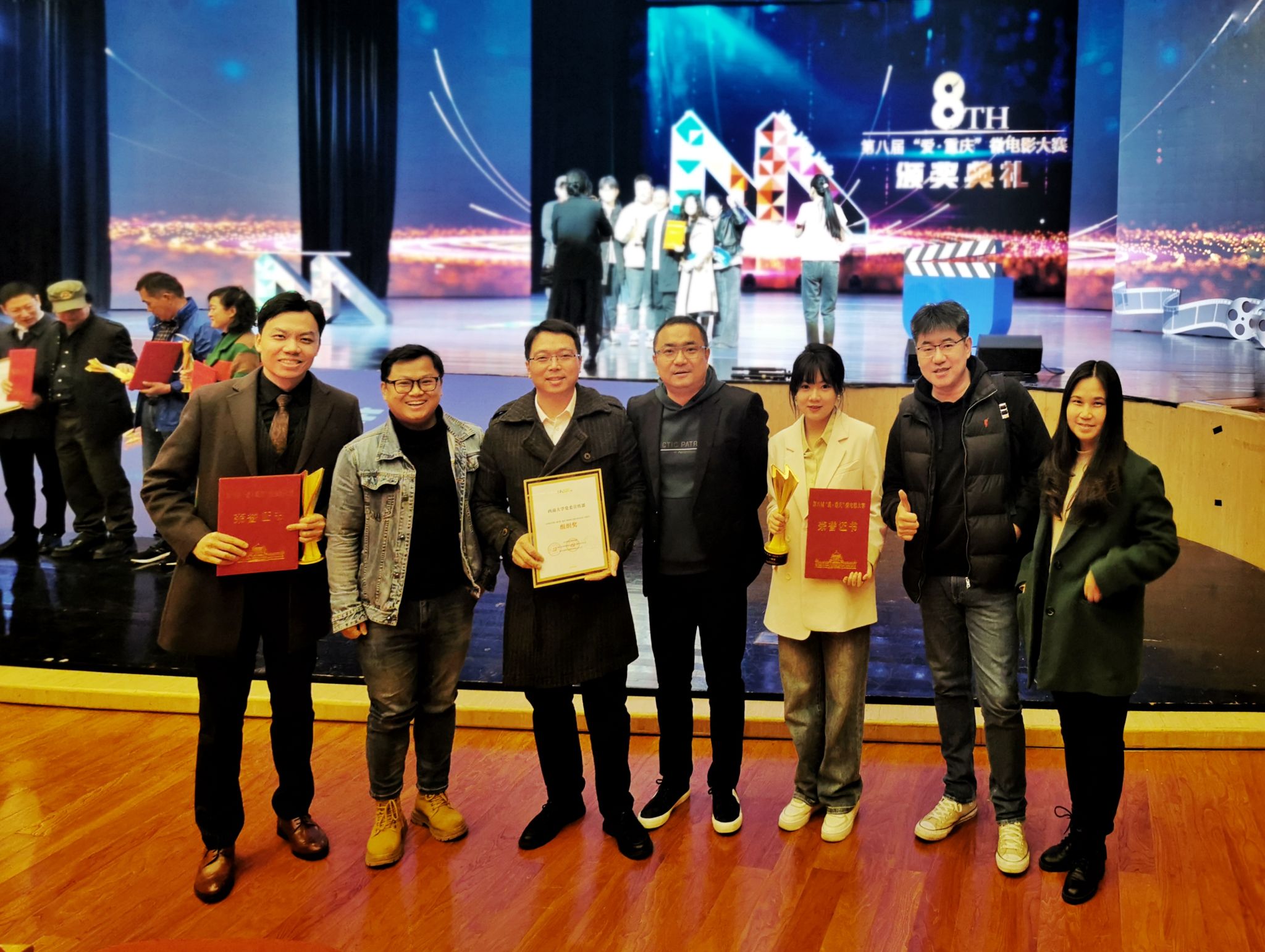 近日,备受瞩目的第八届“爱·重庆”微电影大赛颁奖典礼在重庆市群众艺术馆群星剧院隆重举行。76net必赢官网师生作品在大赛中斩获一、三等奖各一项,优秀剧本奖四项。