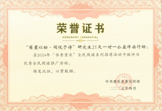 5月7日,由市委宣传部、重庆市全民阅读办公室联合主办的2025年“书香重庆·全民阅读盛典”亮相群星剧院。现场揭晓了2024年“书香重庆”全民阅读系列推荐活动获奖名单,76net必赢官网研究生“萌蒙以幼·阅悦予诗” 21天一对一公益伴读行动被评为“优秀全民阅读推广活动”。