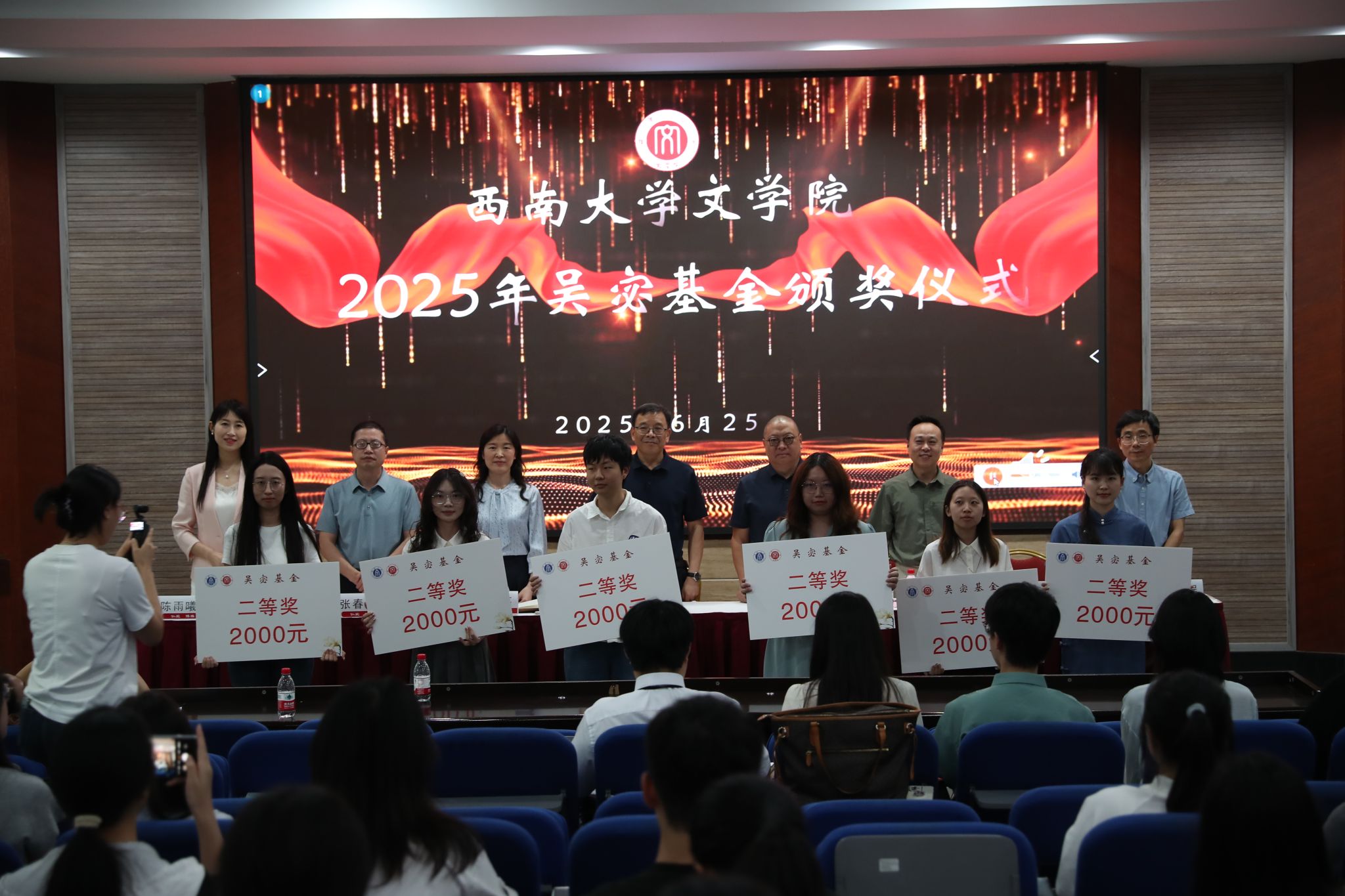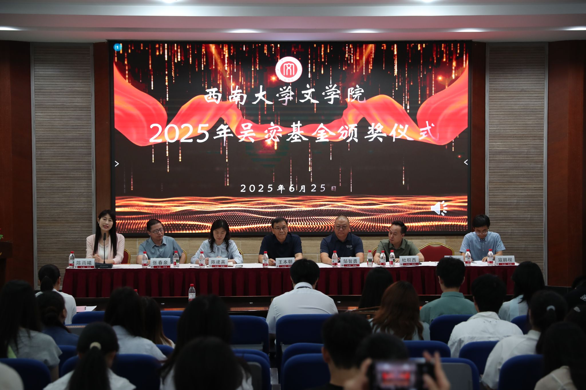 2025年6月25日下午,76net必赢官网举行2025年吴宓基金颁奖仪式,原西南师范大学中文系93级校友、北京时间碎片新媒体有限公司董事长邹智勇,原西南师范大学中文系94级校友、新鸥鹏教育科技有限公司董事长杜积西,原西南师范大学中文系95级校友、尚尚传媒集团董事长朱强章,学校对外联络办公室副主任陈建英,76net必赢官网院长王本朝、党委副书记 纪委书记陈雨曦、副院长张春泉、副院长寇鹏程出席颁奖仪式,全体获奖学生和师生代表参加活动。陈雨曦副书记主持颁奖仪式。