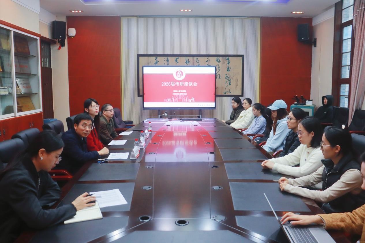 考研备考已进入关键冲刺阶段,为帮助同学们调整备考状态、化解冲刺难题、提振备考信心,学院于11月11日在213会议室举办2026届考研座谈会。学院副书记陈雨曦、副院长张春泉、副院长寇鹏程出席座谈会。
